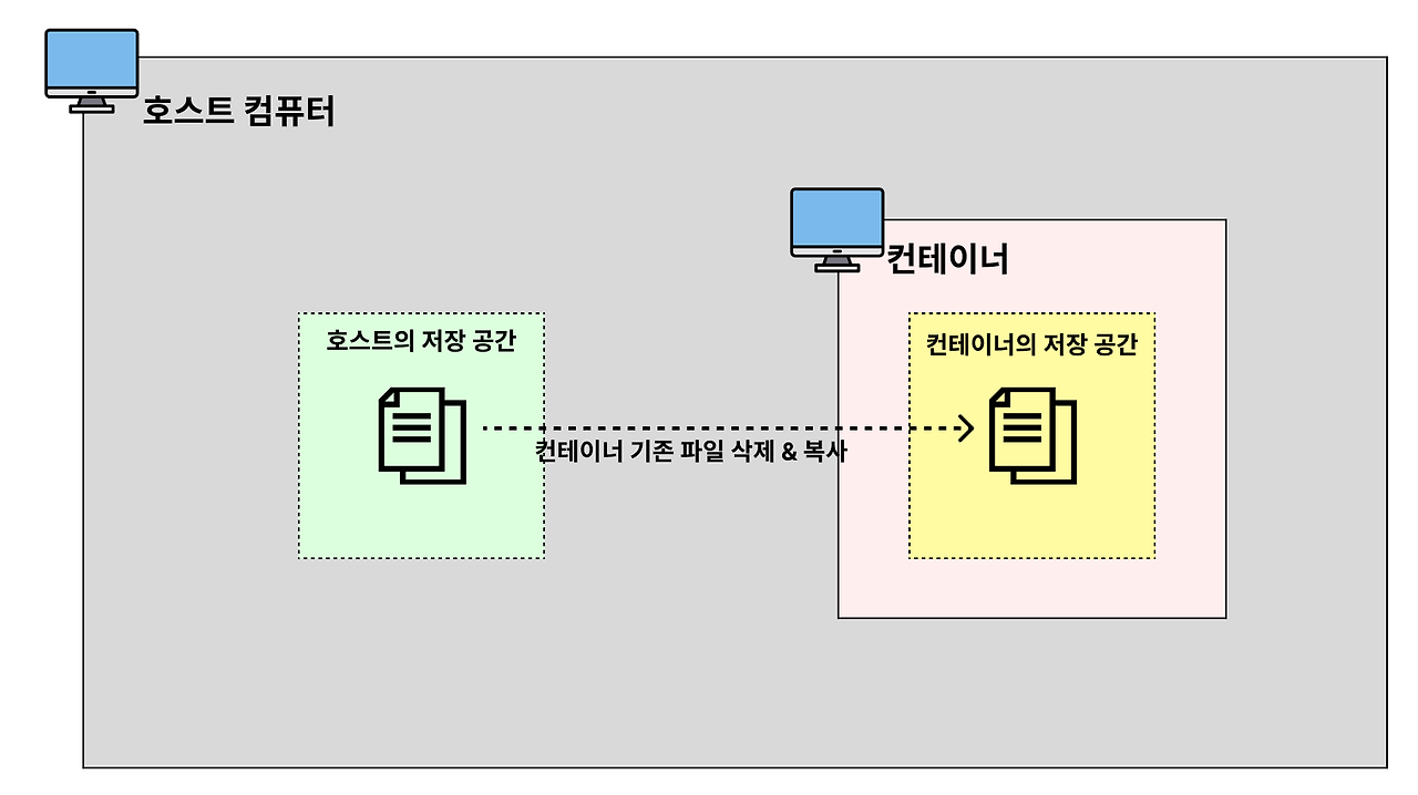 [호스트의 디렉토리 절대 경로]에 디렉토리가 이미 존재할 경우, 호스트의 디렉터리가 컨테이너의 디렉터리를 덮어씌운다.