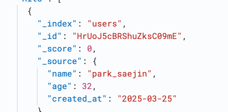 | // 인덱스 생성 PUT /users { "mappings": { "properties": { "name": { "type": "keyword" }, "age": { "type": "integer" }, "created_at": { "type": "date" } } } } // 데이터 삽입 POST /users/_doc { "name": "kim_jisoo", "age": 28, "created_at": "2024-09-01" } POST /users/_doc { "name": "lee_joon", "age": 35, "created_at": "2024-12-15" } POST /users/_doc { "name": "park_saejin", "age": 32, "created_at": "2025-03-25" } |