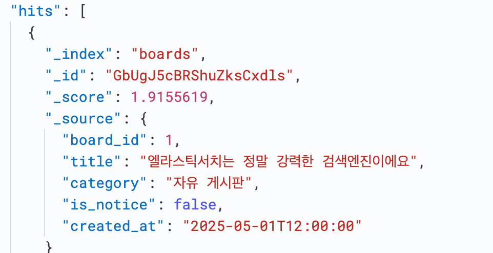 | // 인덱스 생성 PUT /boards { "mappings": { "properties": { "board_id": { "type": "long" }, "title": { "type": "text", // 유연한 검색이 필요하므로 text 타입으로 선언 "analyzer": "nori" // 한글 데이터를 토큰으로 정확하게 나누기 위해 }, "category": { "type": "keyword" // 유연한 검색이 필요없으므로 keyword 타입으로 선언 }, "is_notice": { // (공지글 여부) "type": "boolean" }, "created_at": { "type": "date" } } } } // 데이터 삽입 POST /boards/_doc { "board_id": 1, "title": "엘라스틱서치는 정말 강력한 검색엔진이에요", "category": "자유 게시판", "is_notice": false, "created_at": "2025-05-01T12:00:00" } |