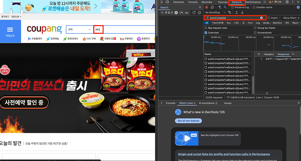 - 쿠팡 서비스에 들어가서 검색 창에 글자를 입력하면 글자에 해당하는 검색어를 추천해준다.