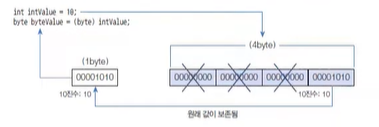 위 그림처럼 int 타입을 byte 타입으로 강제 타입 변환을 하려 할 때, byte의 허용 범위를 넘는 값이라면 값이 손상될 수 있다.