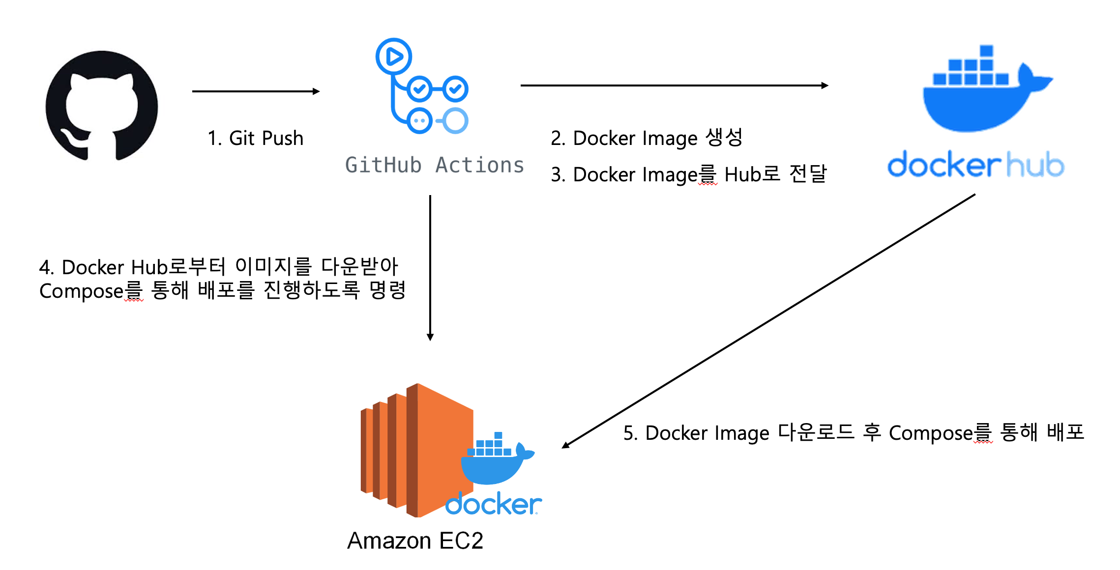 이 방식은 Docker 이미지를 빌드하고 Docker Hub에 푸시한 후, 원격 EC2 서버에서 Docker Compose를 이용해 배포하는 방식이다.