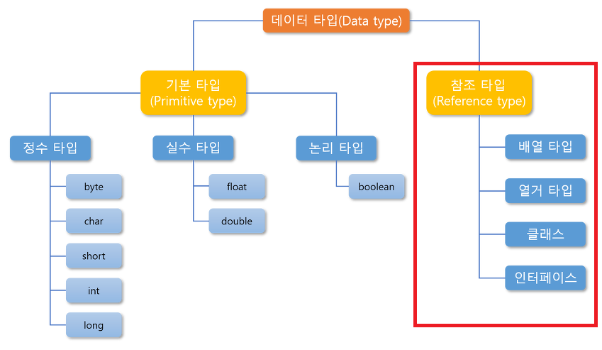 참조 타입이란 객체의 주소를 참조하는 타입으로 배열, 열거, 클래스, 인터페이스를 뜻함 기본 타입은 실제 값을 변수 안에 저장하지만, 참조 타입은 메모리의 주소를 변수 안에 저장한다. 주소를 통해 객체를 참조한다는 뜻에서 참조 타입이라고 부른다.