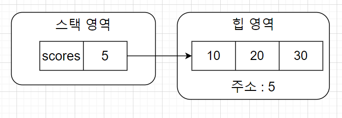 다음과 같이 배열 변수인 scores는 스택 영역에 생성되지만 실제 10, 20, 30을 갖는 배열은 힙 영역에 생성됨. 배열 변수인 scores에는 배열의 힙영역의 주소가 저장됨. 참고로 자바에서는 배열을 객체로 취급함