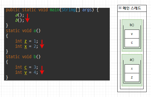 변수는 선언된 블록 안에서만 스택에 존재하고 블록을 벗어나면 스택에서 제거됨
