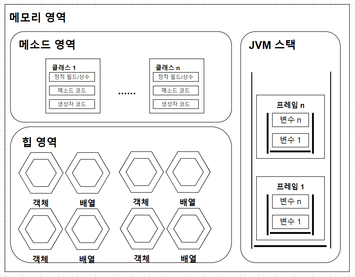 정리하자면 메소드가 호출되면 JVM스택에는 프레임이 들어가고 프레임 안에는 여러 변수가 있다. 기본 타입의 경우는 변수 자체에 저장되지만, 참조 타입은 힙 영역에 객체로 생성되며 변수는 힙 영역에 생성된 객체의 주소값을 참조하고 있다. 메소드가 종료되면 JVM 스택에서 프레임이 제거된다. 힙 영역에서 객체를 참조하는 변수가 하나도 없다면 Garbage Collector가 객체를 수거한다.