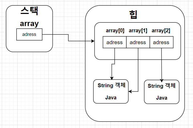 기본 타입(byte, int등등) 배열은 각 항목에 직접 값을 갖고 있지만, 참조타입(클래스, 인터페이스) 배열은 각 항목에 객체의 번지를 가지고 있다. 예를 들어 String은 클래스이므로 String[]배열은 각 항목에 문자열이 아니라, String 객체의 번지를 가지고 있다. 즉 String[] 배열은 String 객체를 참조하게 된다.