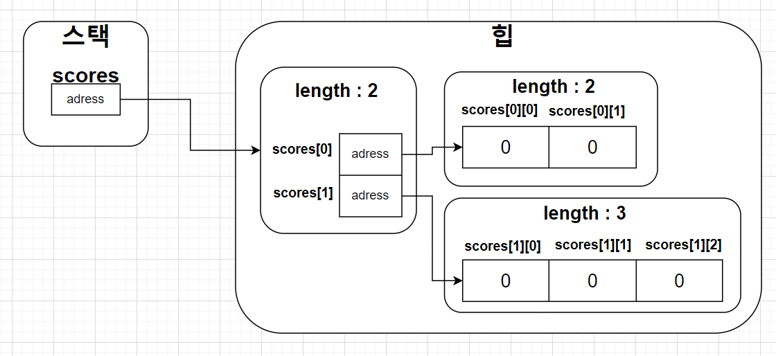 배열은 객체이므로 힙 영역에 생성되고, 배열 변수는 힙 영역의 배열 객체를 참조하게 된다.