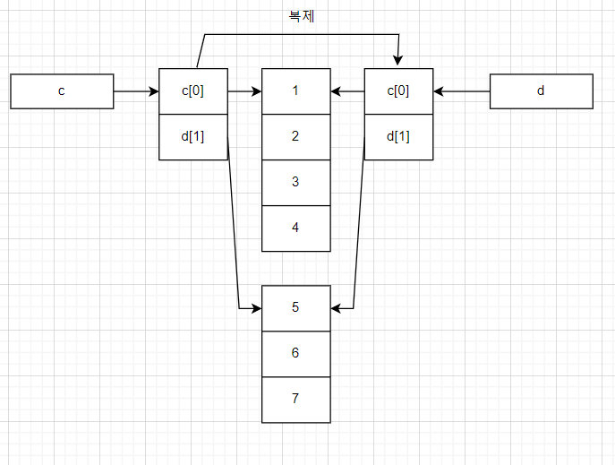 하지만 다차원 배열의 복제는 최상위 1레벨만 수행한다. 아래 코드에서 c[0]과 c[1]만 복제되고, 그 아래 레벨의 배열은 복제되지 않고 공유된다.